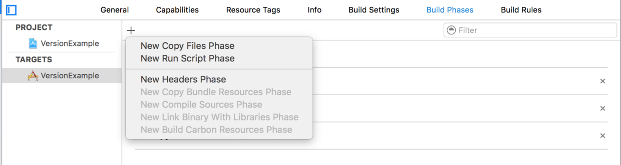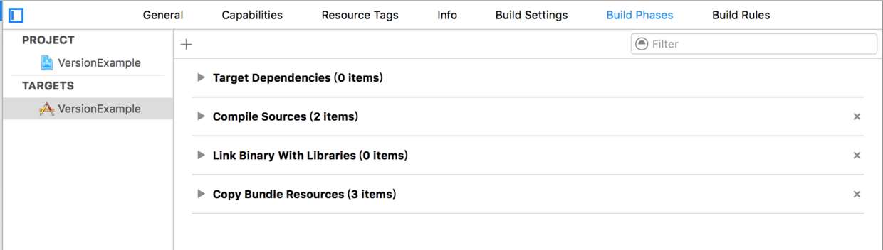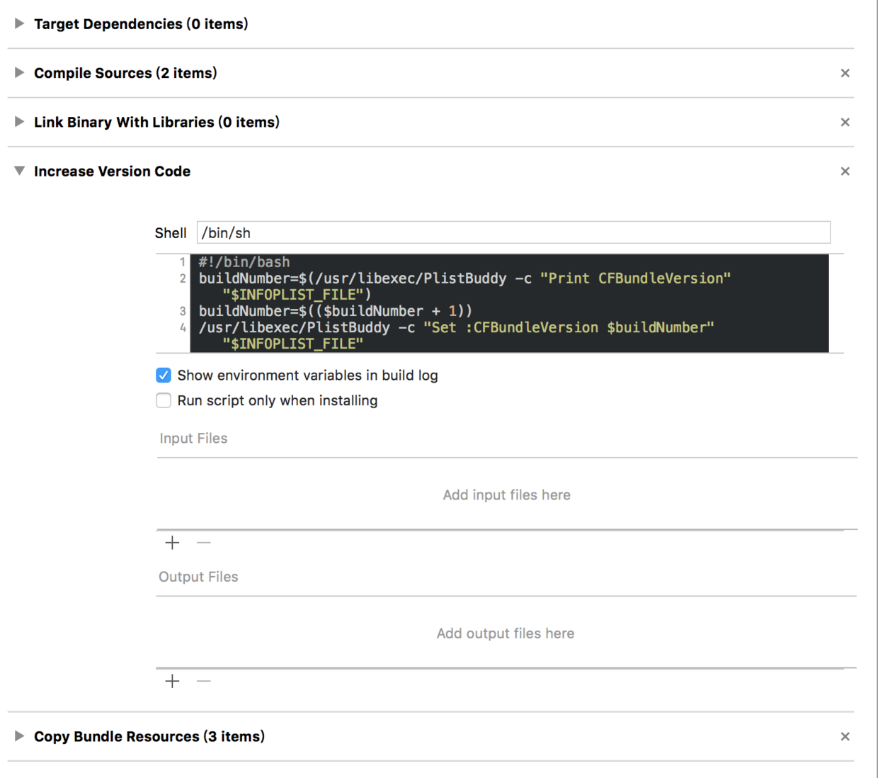 添加编译过程,读取并修改Info.plist中的版本信息:1. 打开工程,选择编译目标,点击 `Build Phases` 选项卡。2. 点击左上角的 **+** 添加,选择 `New Run Script Phase` 添加一个编译脚本。img_03.pngimg_04.png3. 在脚本编辑其中输入下面的脚本:img_05.png` #!/bin/bash buildNumber=$(/usr/libexec/PlistBuddy -c "Print CFBundleVersion" "$INFOPLIST_FILE") buildNumber=$(($buildNumber + 1)) /usr/libexec/PlistBuddy -c "Set :CFBundleVersion $buildNumber" "$INFOPLIST_FILE"`上述脚本使用 PlistBuddy工具,读取 `Info.plist` 中的 `CFBundleVersion` 值,+1 后写回 `Info.plist` 中。 4. 我们需要让该段代码在应用打包前执行,以便将修改应用到App包内,因此我们将该编译过程重命名为 `Increase Version Code` 并移动到 `Copy Bundle Resources`之前。5. 这样,当我们每次编译该 Target 时 ,就会执行改脚本将 `CFBundleVersion` 值增加1,但没次调试运行时,该值都会加1,这并不是我们想要的,我们只需要在每次打包发布时增加1就行,因此,我们将 `Run script only wehn installing` 前的勾打上,这样就只会在打包应用时执行改脚本。img_06.pngimg_07.pngAndroid Studio