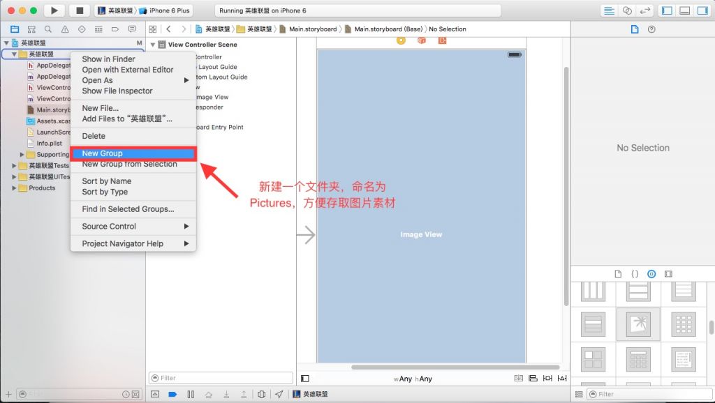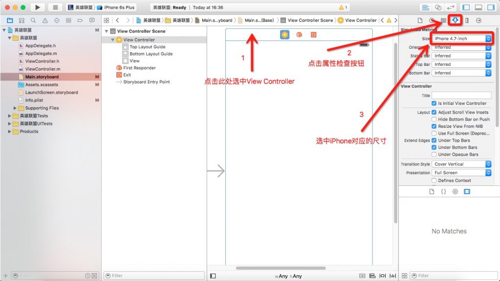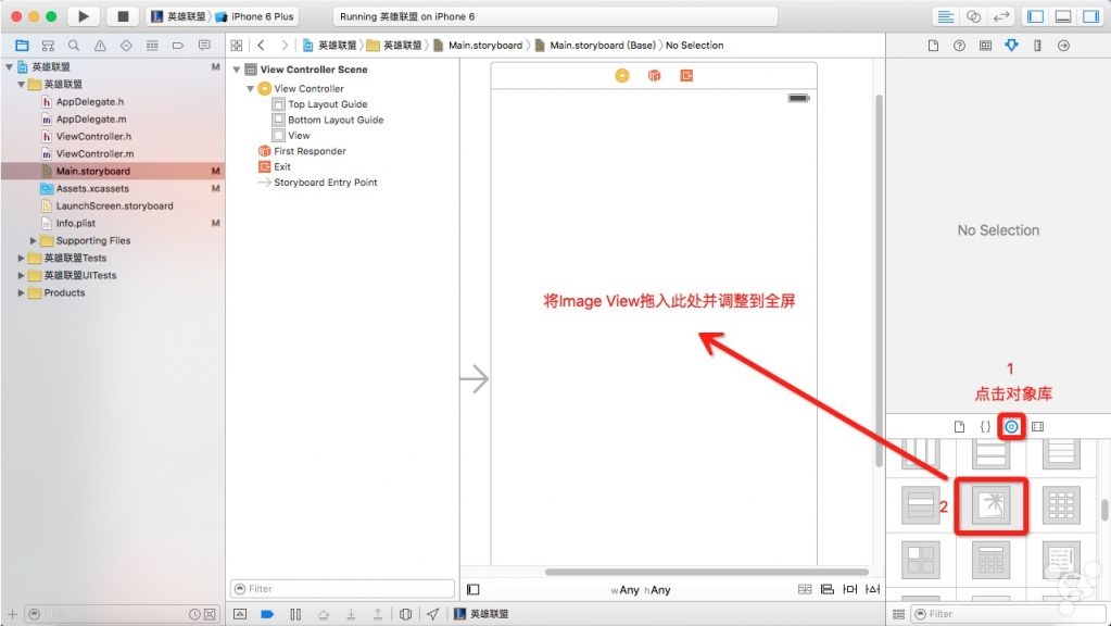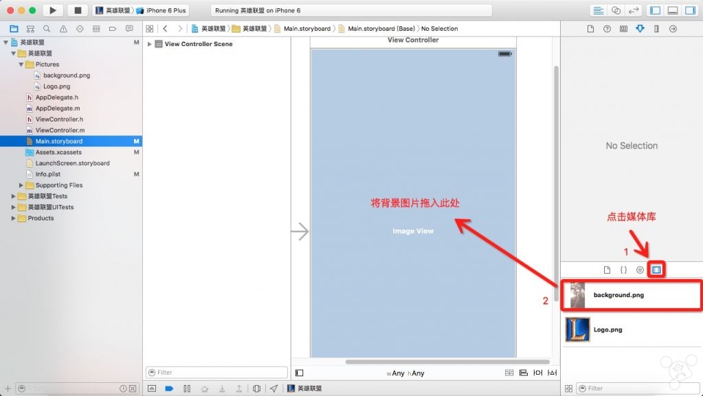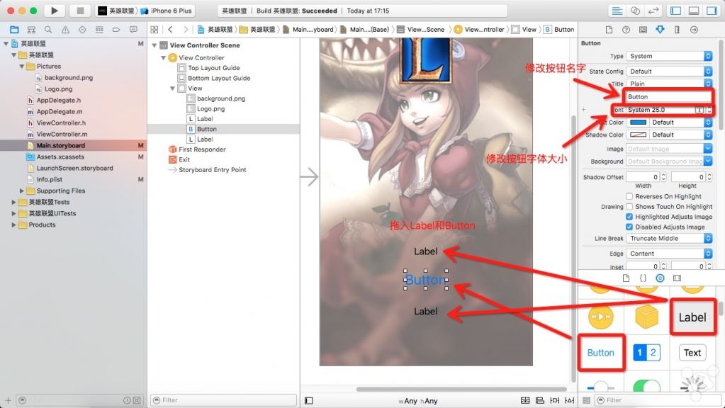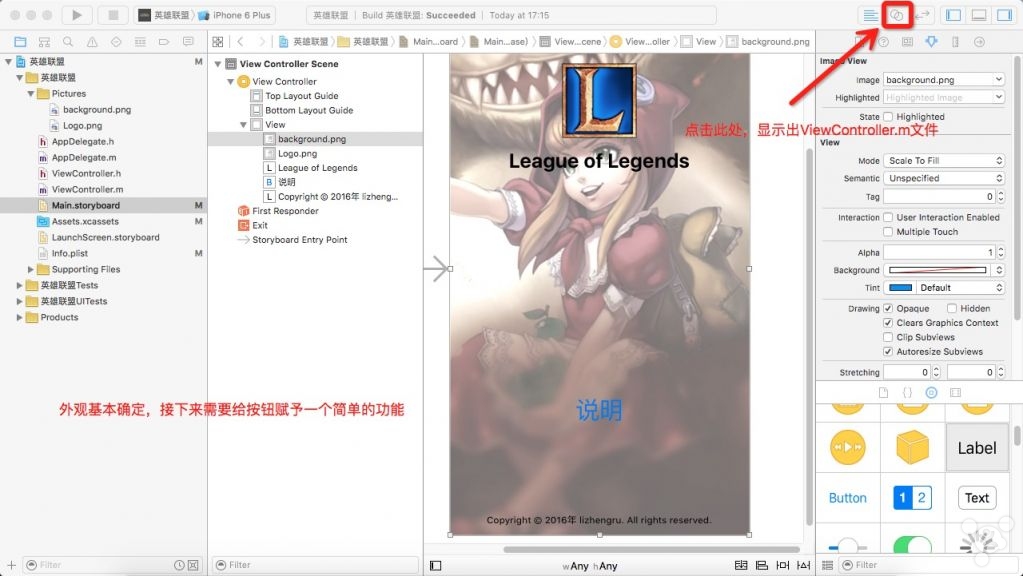 7. 修改View Controller属性,添加图像视图,拖入Label和Button控件并适当修改其外观属性。