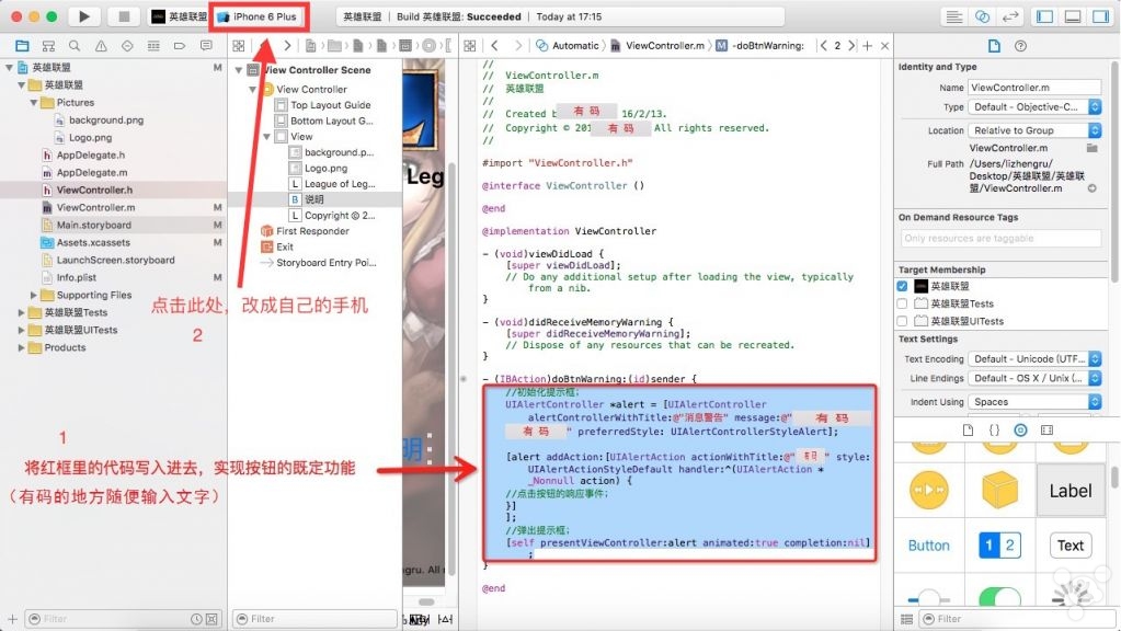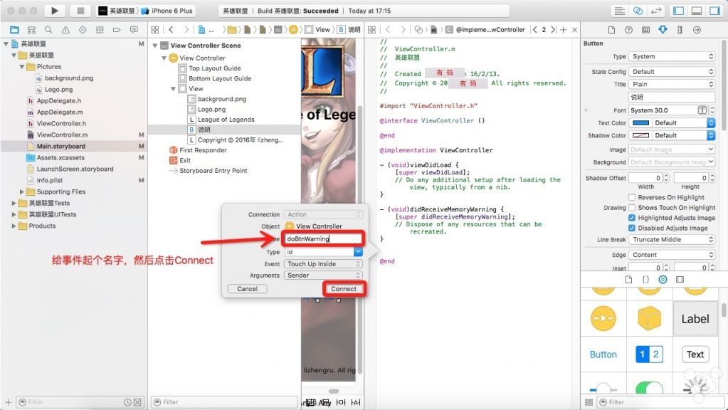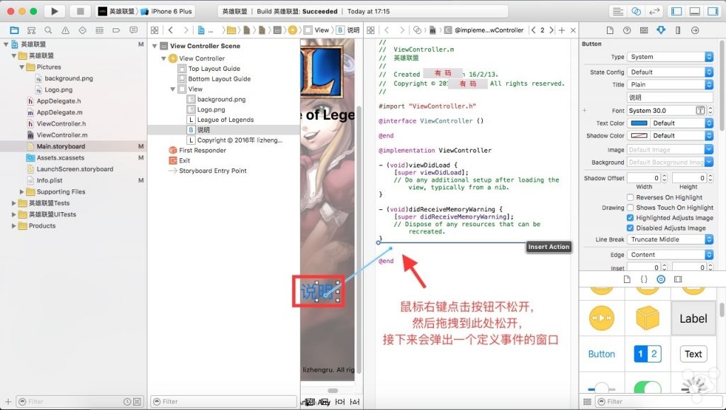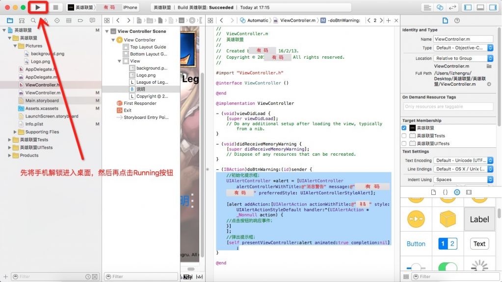 8. 修改**`ViewController.m文件,赋予按钮功能。