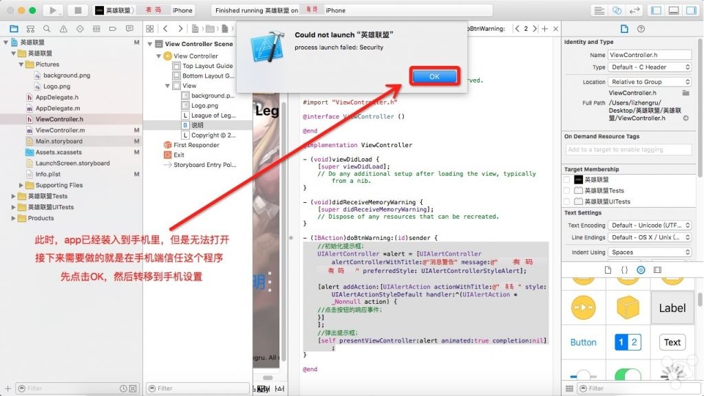 10. 此时程序已经安装在手机里面了,但是得不到系统的信任,现在要做的就是手机解锁屏幕,定位到**`设置-通用-设备管理-开发商应用,信任你的Apple ID,然后再次点击Xcode里的Running。恭喜,你已经成功的完成了开发一个完整的程序,试着点击它吧。
