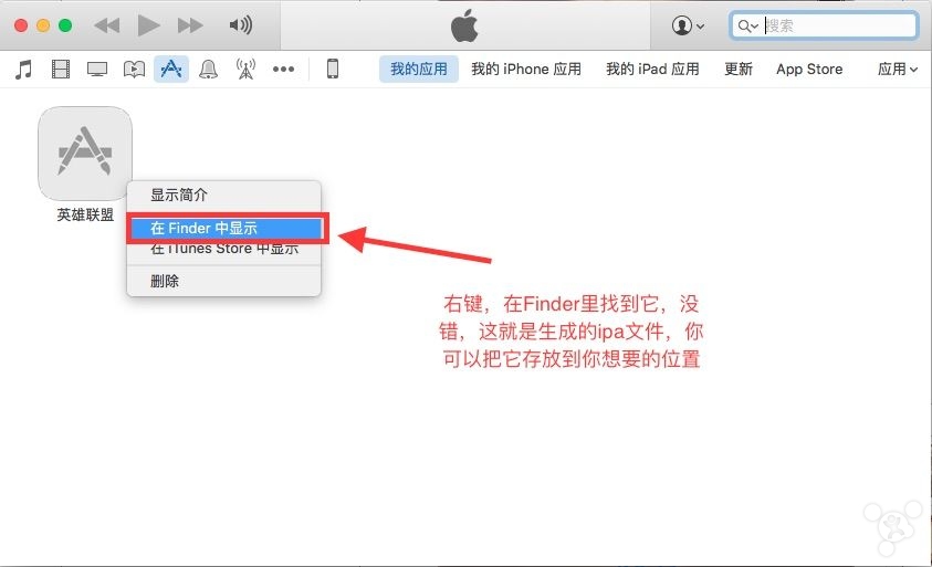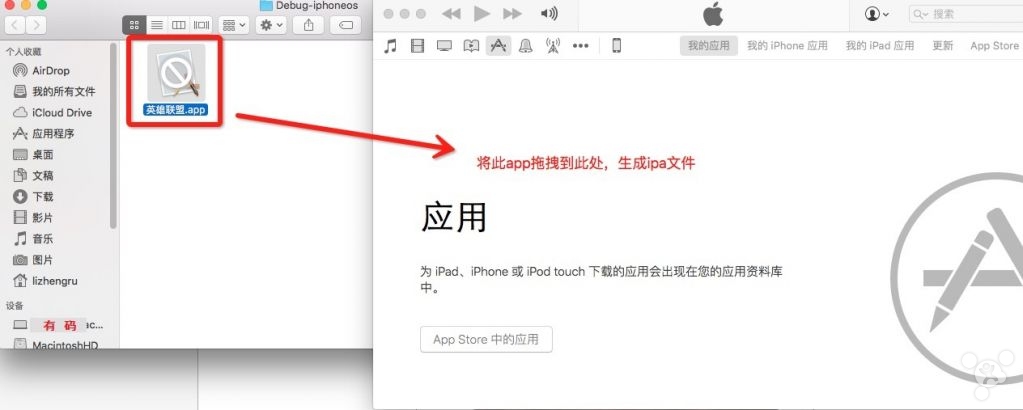 II. 将找到的XXXX.app文件拖拽到打开的iTunes我的应用页面空白处,这样就生成了最终的XXXX.ipa文件。