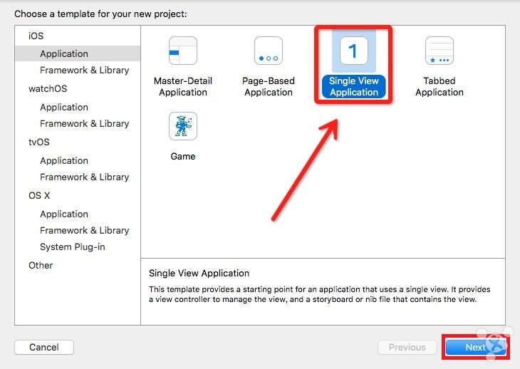 3. 选择**Create a new Xcode project创建一个新的项目,然后选择单视图,点击下一步**。