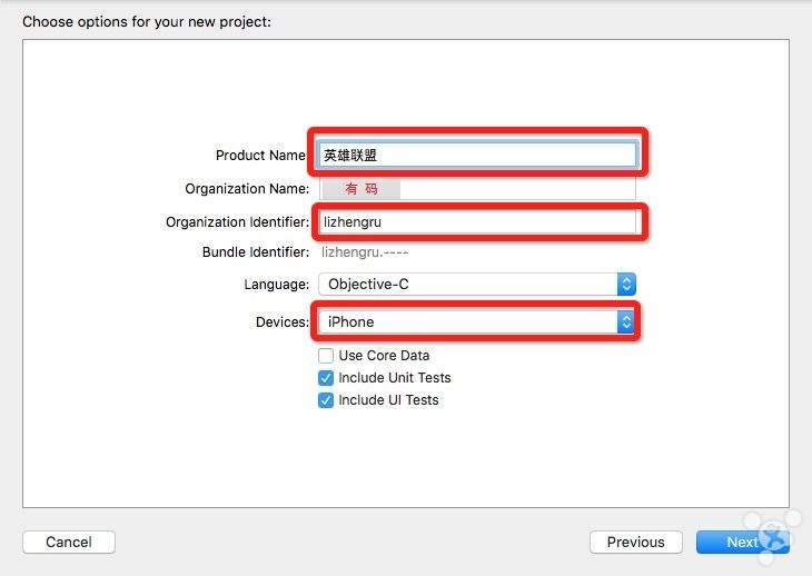 4. 输入项目名称(Product Name),公司标识前缀名(Organization identifier),开发语言(Language),设备(Devices),并点击下一步,然后选择工程保存的地方,点击**Create**。