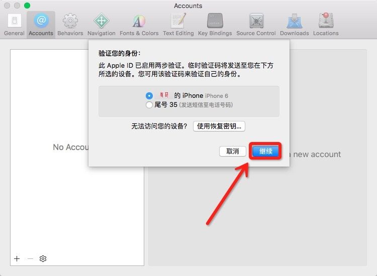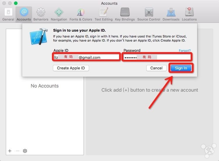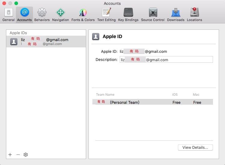 5. 修复代码签名问题,添加Apple ID,开启两步验证的需要验证一下,添加完成后如图,关闭Accounts窗口,提示Reset的,请点击Reset,不提示的请忽略此步,至此,代码签名问题已修复。