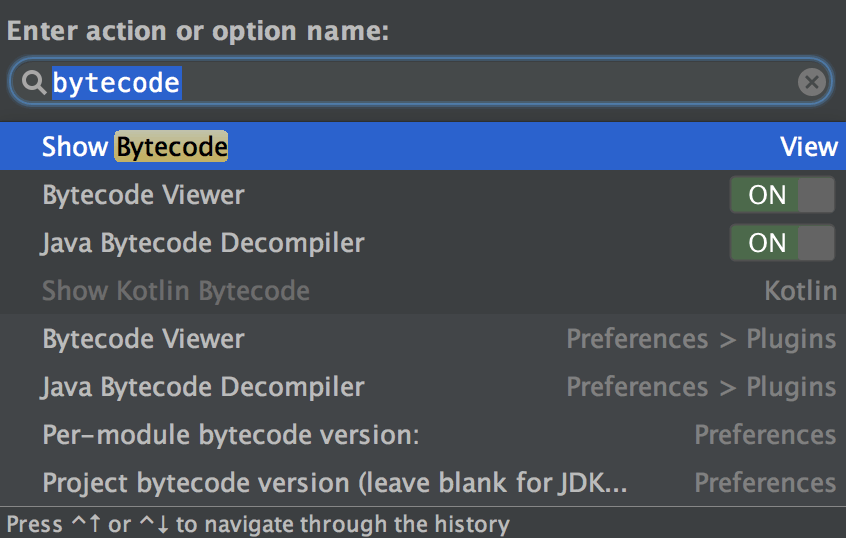 使用这个快捷键,你想到什么功能,打开它搜索就可以了;打个比方,我想看看Java的for each循环和普通的for循环底层是不是同一个实现;那么我就需要看虚拟机字节码了;我记得有这个功能但是不知道快捷键是啥;OK,Cmd + shift + A,输入bytecode: