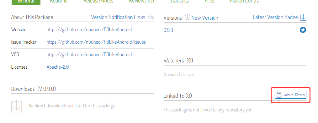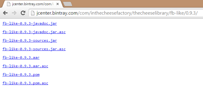 想要在jcenter上查看你的library文件?你可以通过访问http://jcenter.bintray.com,通过library的group id和artifact id来匹配浏览。在这个例子里,应该是:com -> inthecheesefactory -> thecheeselibrary -> fb-like -> 0.9.3。