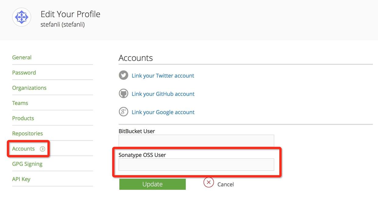 最后要做的是,在Bintray Profile的账号选项卡页面,填入Sonatype OSS的用户名。
