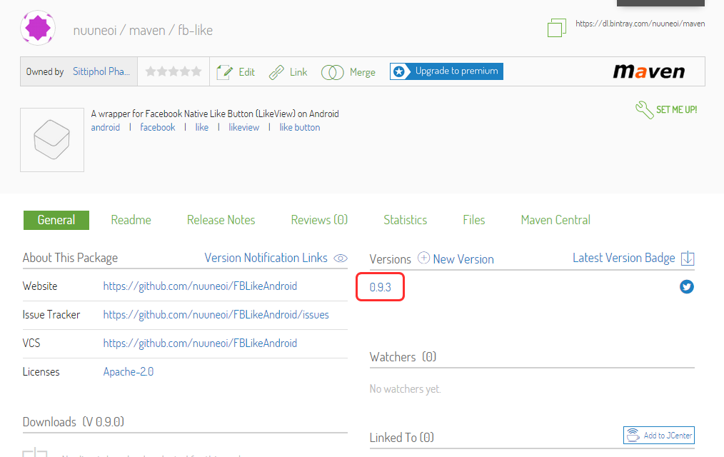 GROUP_ID是com.inthecheesefactory.thecheeselibrary,ARTIFACT_ID是fb-like,VERSION是0.9.3