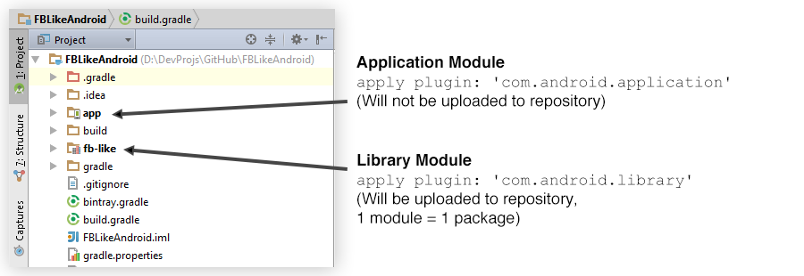 在许多情况下,我们可能在一个项目里,需要上传多个library,也可能不需要。所以我建议最好的结构是按照Module来划分,基本上我建议最少有两个Module,一个应用程序的Module,一个包含了你想要上传到远程仓库源码的library的Module。请注意,如果在你的项目里不止包含了一个library,请创建另外一个Module:每一个library对应一个Module。