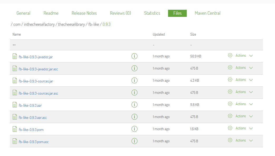 一旦完成,你可以在Maven Central Repository 找到自己的library文件,匹配规则同上,在这个例子中,应该是:com -> inthecheesefactory -> thecheeselibrary -> fb-like -> 0.9.3。