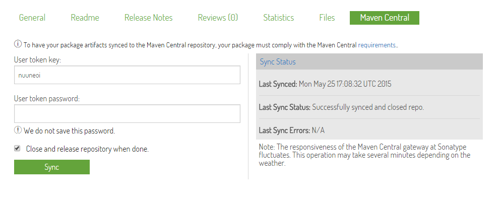 如果你已经有了这些资格,那么提交library文件到Maven Central也是非常的简单。仅仅需要点击Maven Central连接到包的详细页面。