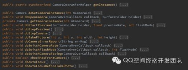 第二步:编写相机操作功能类CameraOperationHelper。采用单例模式来统一管理相机资源,封装相机API的直接调用,并提供用于跟自定义相机Activity做UI交互的回调接口,其功能函数如下,主要有创建\释放相机,连接\开始\关闭预览界面,拍照,自动对焦,切换前后摄像头,切换闪光灯模式等,具体实现可以参考官方API文档。