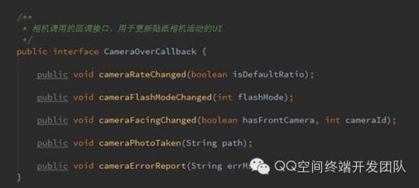 第三步:编写自定义相机Activity,主要是定制相机界面,实现UI交互逻辑,如按钮点击事件处理,icon资源切换,镜头尺寸切换动画等。这里需要声明一个SurfaceView对象来实时显示相机预览画面。通过SurfaceHolder及其Callback接口来一同管理屏幕surface和相机资源的连接,相机预览图像的显示/关闭。