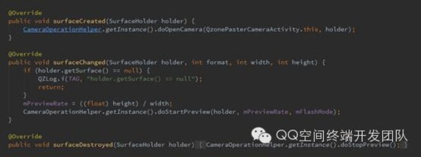 surfaceCreated(SurfaceHolder holder)**:在surface创建后立即被调用。在开发自定义相机时,可以通过重载这个函数调用camera.open()、camera.setPreviewDisplay(),来实现获取相机资源、连接camera和surface等操作。surfaceChanged(SurfaceHolder holder, int format, int width, int height):在surface发生format或size变化时调用。在开发自定义相机时,可以通过重载这个函数调用camera.startPreview来开启相机预览,使得camera预览帧数据可以传递给surface,从而实时显示相机预览图像。**