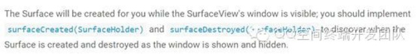 surfaceDestroyed(SurfaceHolder holder)**:在surface销毁之前被调用。在开发自定义相机时,可以通过重载这个函数调用camera.stopPreview(),camera.release()来实现停止相机预览及释放相机资源等操作。