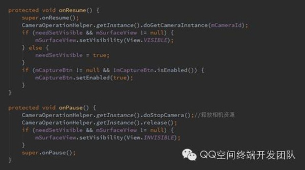 为了节省手机电量,不浪费相机资源,在开发的自定义相机里,如果预览图像已不需要显示,如按Home键盘切换后台或者锁屏后,此时就应该关闭预览并把相机资源释放掉。参考官方API文档,当surfaceView变成可见时,会创建surface并触发surfaceHolder.callback接口中surfaceCreated回调函数。而surfaceview变成不可见时,则会销毁surface,并触发surfacedestroyed回调函数。我们可以在对应的回调函数里,处理相机的相关操作,如连接surface、开启/关闭预览。 至于相机资源释放,则可以放在Acticity的onpause里执行。相应的,要重新恢复预览图像时,可以把相机资源申请和初始化放在Acticity的onResume里执行,然后通过创建surfaceview,将camera和surface相连并开启预览。