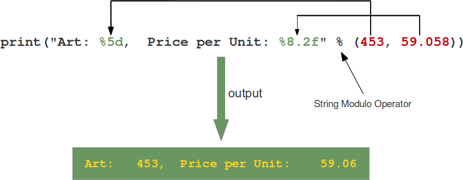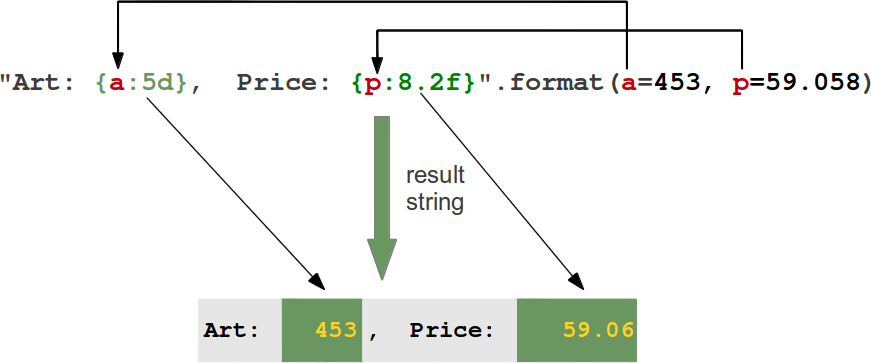 1 | "Art: {a:5d}, Price: {p:8.2f}".format(a=453, p=59.058) |